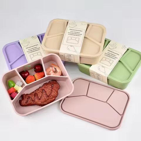 Food-grade Silicone 4-compartment Lunch Box, Microwave Safe, Insulated, for Students & Office Workers